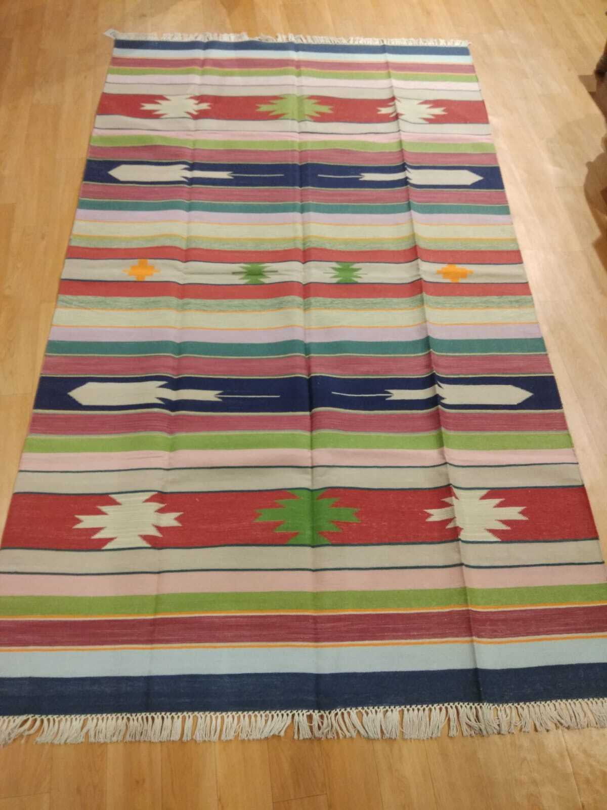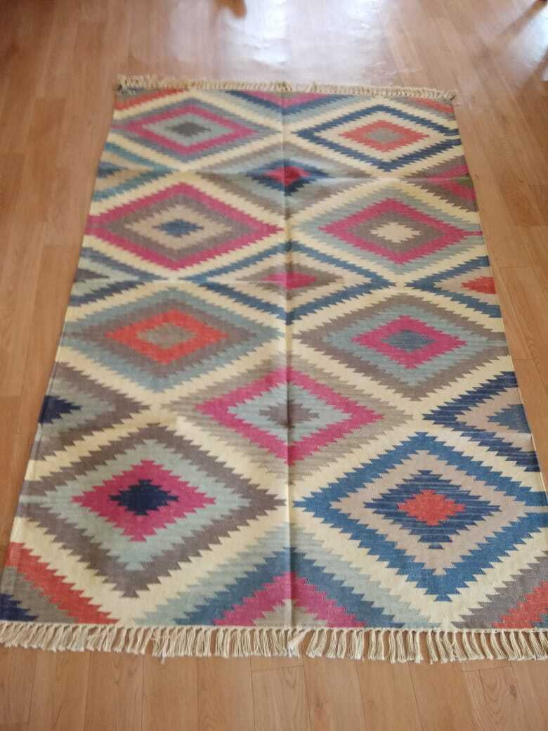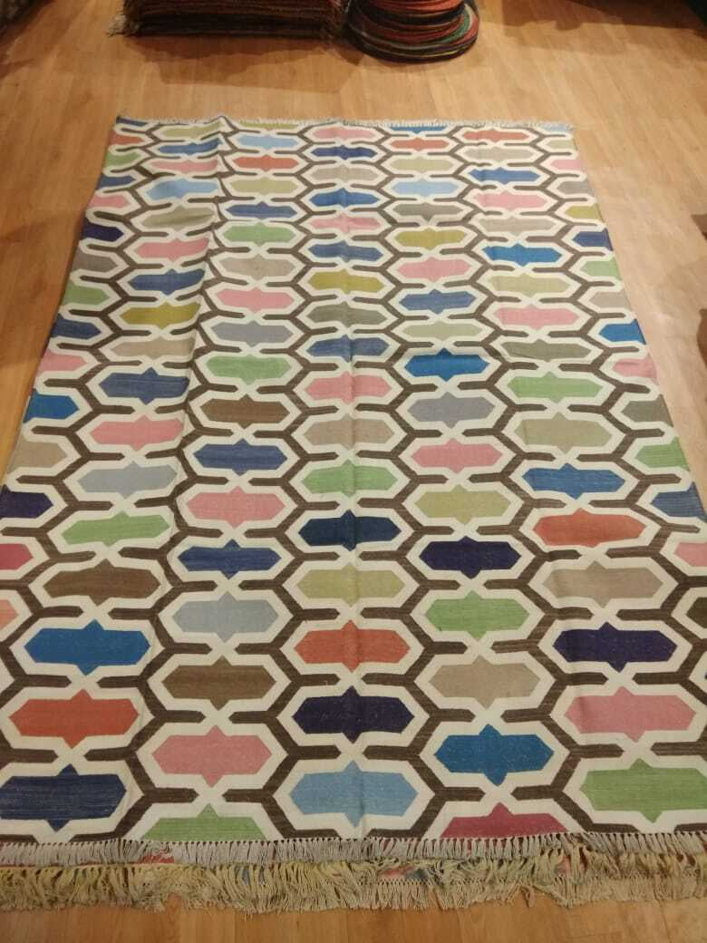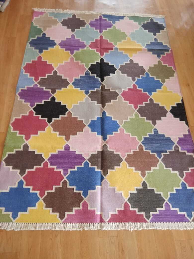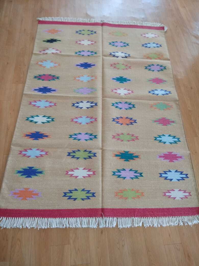 The traditional handloom dhurries are woven on pit looms and frame looms. As a pre-weaving step, the yarns are dyed in desired colours depending on the design in mind. Generally, only the yarns to be used in the weft are dyed. White or natural beige-coloured yarns are used in the warp. Conventionally, the yarns would be starched and/or bleached to add stiffness to them. Once ready, both the warp and weft yarns are set on the handloom and interlocked into beautiful dhurries with symmetrical patterns.