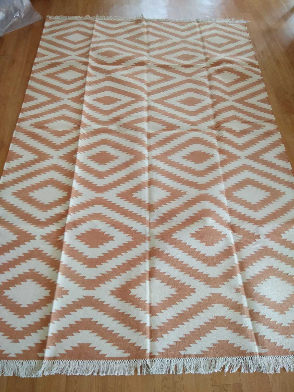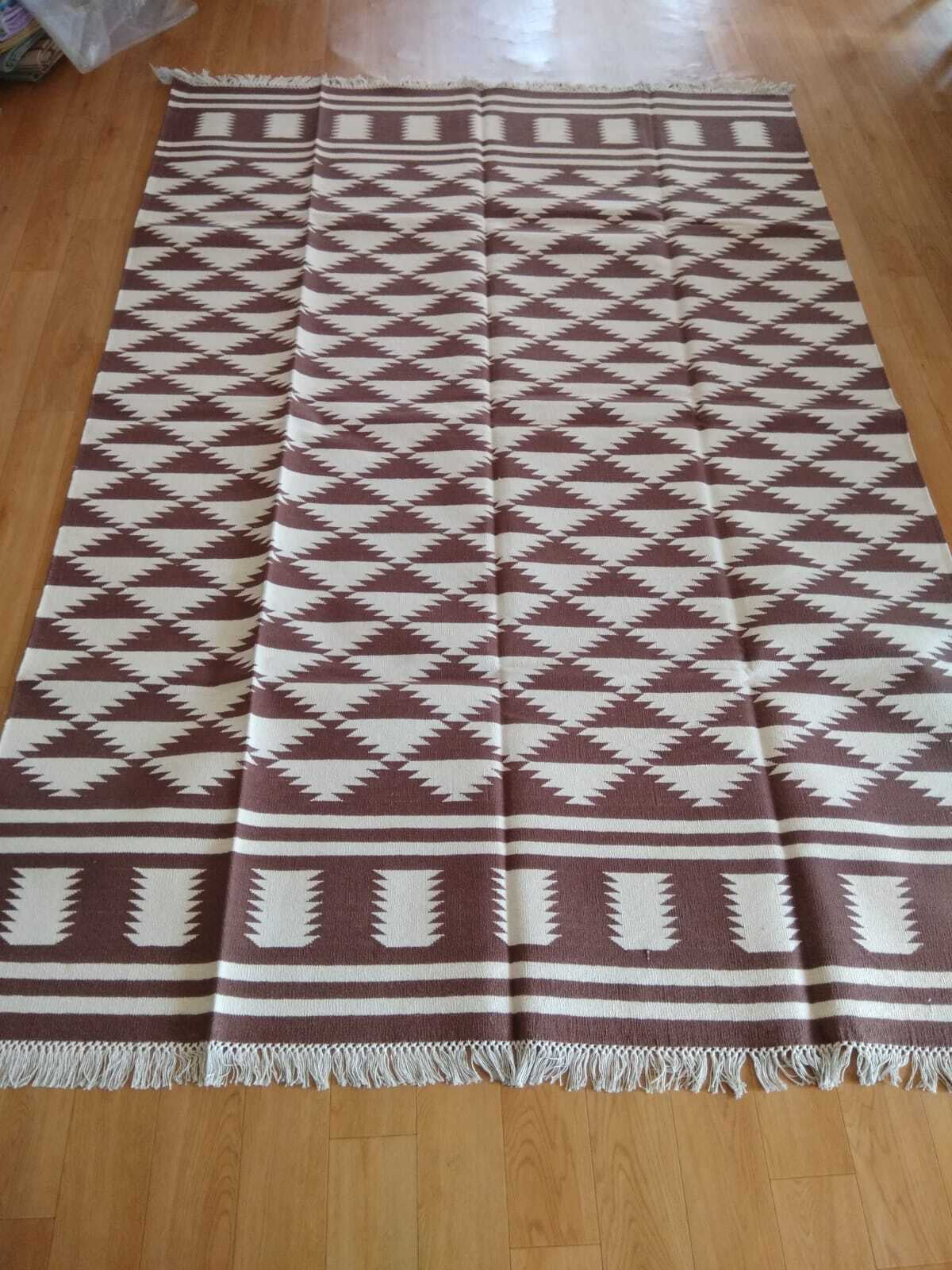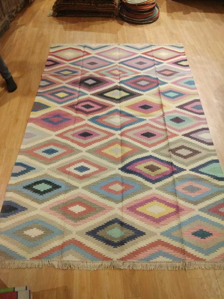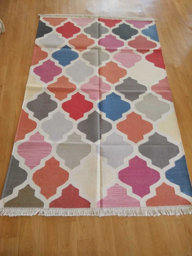 The traditional handloom dhurries are woven on pit looms and frame looms. As a pre-weaving step, the yarns are dyed in desired colours depending on the design in mind. Generally, only the yarns to be used in the weft are dyed. White or natural beige-coloured yarns are used in the warp. Conventionally, the yarns would be starched and/or bleached to add stiffness to them. Once ready, both the warp and weft yarns are set on the handloom and interlocked into beautiful dhurries with symmetrical patterns.